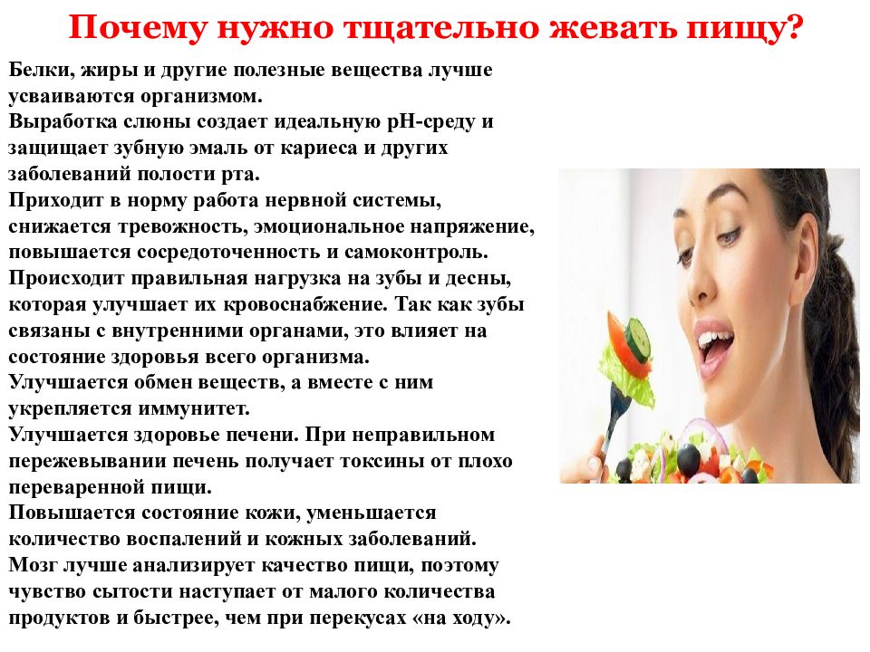 Белки, жиры и другие полезные вещества лучше усваиваются организмом. Выработка слюны создает идеальную pH -среду и защищает зубную эмаль от кариеса и других заболеваний полости рта. Приходит в норму работа нервной системы, снижается тревожность, эмоциональное напряжение, повышается сосредоточенность и самоконтроль. Происходит правильная нагрузка на зубы и десны, которая улучшает их кровоснабжение. Так как зубы связаны с внутренними органами, это влияет на состояние здоровья всего организма. Улучшается обмен веществ, а вместе с ним укрепляется иммунитет. Улучшается здоровье печени. При неправильном пережевывании печень получает токсины от плохо переваренной пищи. Повышается состояние кожи, уменьшается количество воспалений и кожных заболеваний. Мозг лучше анализирует качество пищи, поэтому чувство сытости наступает от малого количества продуктов и быстрее, чем при перекусах «на ходу». Почему нужно тщательно жевать пищу?