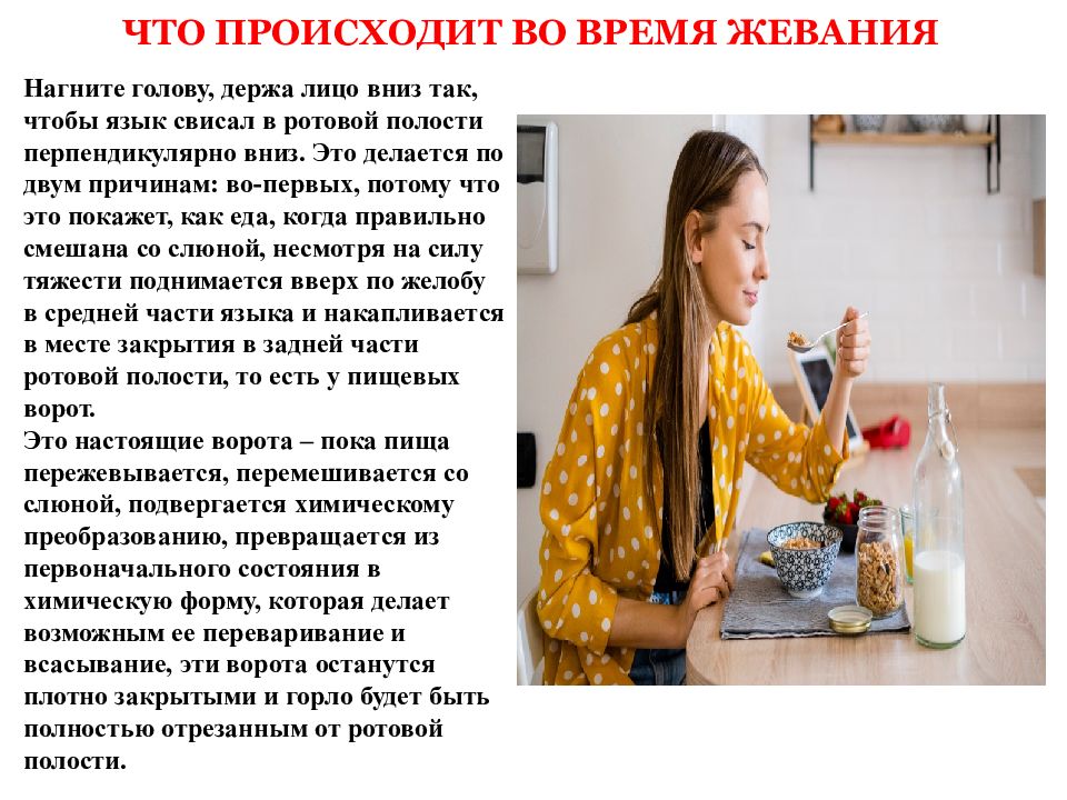 Нагните голову, держа лицо вниз так, чтобы язык свисал в ротовой полости перпендикулярно вниз. Это делается по двум причинам: во-первых, потому что это покажет, как еда, когда правильно смешана со слюной, несмотря на силу тяжести поднимается вверх по желобу в средней части языка и накапливается в месте закрытия в задней части ротовой полости, то есть у пищевых ворот. Это настоящие ворота – пока пища пережевывается, перемешивается со слюной, подвергается химическому преобразованию, превращается из первоначального состояния в химическую форму, которая делает возможным ее переваривание и всасывание, эти ворота останутся плотно закрытыми и горло будет быть полностью отрезанным от ротовой полости. ЧТО ПРОИСХОДИТ ВО ВРЕМЯ ЖЕВАНИЯ