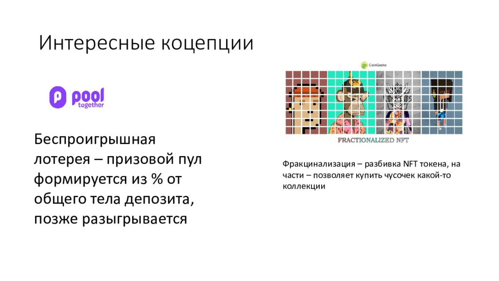 Беспроигрышная лотерея – призовой пул формируется из % от общего тела депозита, позже разыгрывается Фракцинализация – разбивка NFT токена, на части – позволяет купить чусочек какой-то коллекции
