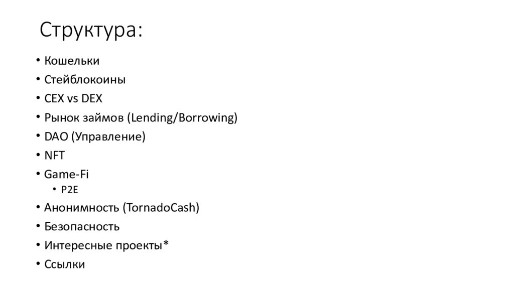 Кошельки Стейблокоины CEX vs DEX Рынок займов ( Lending/Borrowing) DAO ( Управление) NFT Game-Fi P2E Анонимность ( TornadoCash ) Безопасность Интересные проекты* Ссылки