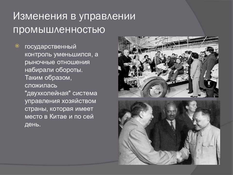государственный контроль уменьшился, а рыночные отношения набирали обороты. Таким образом, сложилась "двухколейная" система управления хозяйством страны, которая имеет место в Китае и по сей день.