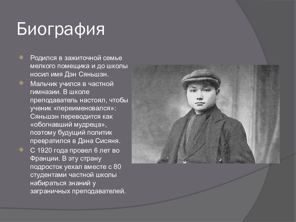 Родился в зажиточной семье мелкого помещика и до школы носил имя Дэн Сяньшэн. Мальчик учился в частной гимназии. В школе преподаватель настоял, чтобы ученик «переименовался»: Сяньшэн переводится как «обогнавший мудреца», поэтому будущий политик превратился в Дэна Сисяня. С 1920 года провел 6 лет во Франции. В эту страну подросток уехал вместе с 80 студентами частной школы набираться знаний у заграничных преподавателей.