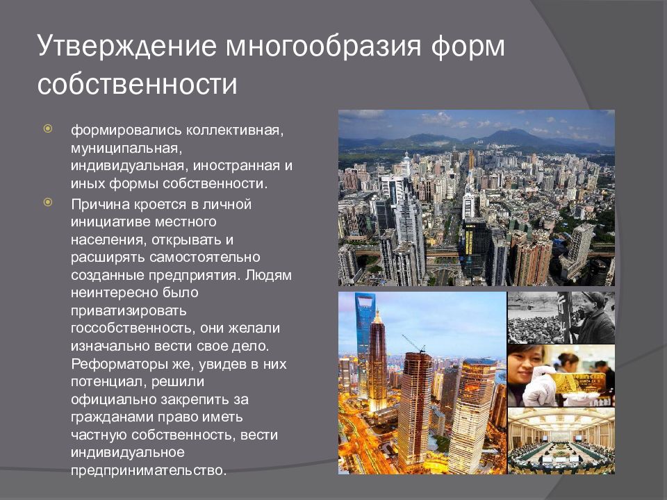 формировались коллективная, муниципальная, индивидуальная, иностранная и иных формы собственности. Причина кроется в личной инициативе местного населения, открывать и расширять самостоятельно созданные предприятия. Людям неинтересно было приватизировать госсобственность, они желали изначально вести свое дело. Реформаторы же, увидев в них потенциал, решили официально закрепить за гражданами право иметь частную собственность, вести индивидуальное предпринимательство.