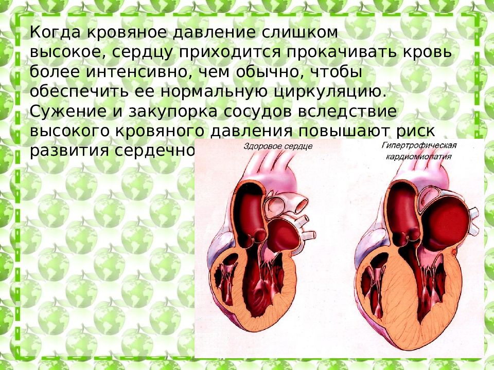 Когда кровяное давление слишком высокое, сердцу приходится прокачивать кровь более интенсивно, чем обычно, чтобы обеспечить ее нормальную циркуляцию. Сужение и закупорка сосудов вследствие высокого кровяного давления повышают риск развития сердечной недостаточности.