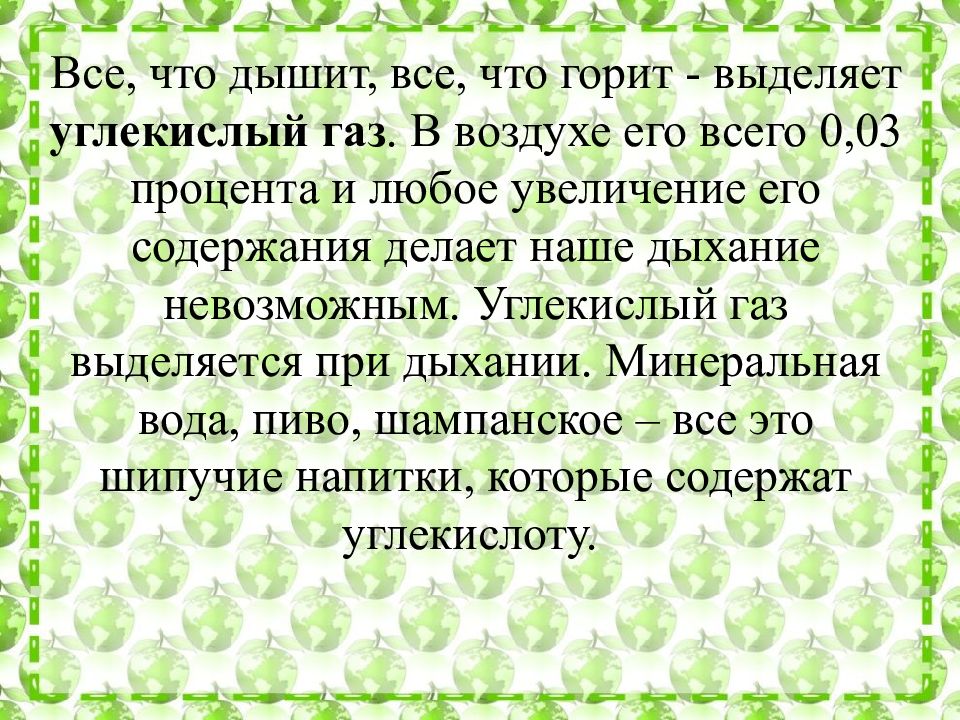 Все, что дышит, все, что горит - выделяет углекислый газ. В воздухе его всего 0,03 процента и любое увеличение его содержания делает наше дыхание невозможным. Углекислый газ выделяется при дыхании. Минеральная вода, пиво, шампанское – все это шипучие напитки, которые содержат углекислоту.