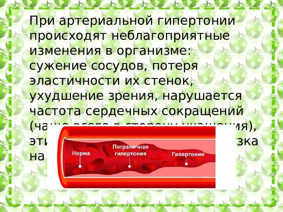 При артериальной гипертонии происходят неблагоприятные изменения в организме: сужение сосудов, потеря эластичности их стенок, ухудшение зрения, нарушается частота сердечных сокращений (чаще всего в сторону учащения), этим самым повышается нагрузка на сердце, почки