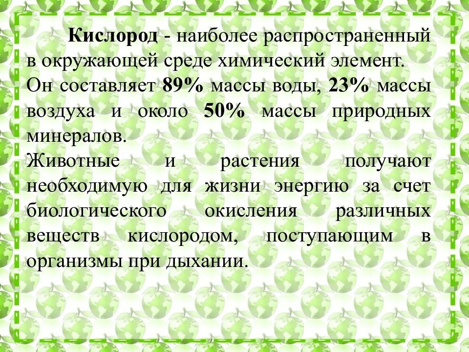 Кислород - наиболее распространенный в окружающей среде химический элемент. Он составляет 89% массы воды, 23% массы воздуха и около 50% массы природных минералов. Животные и растения получают необходимую для жизни энергию за счет биологического окисления различных веществ кислородом, поступающим в организмы при дыхании.