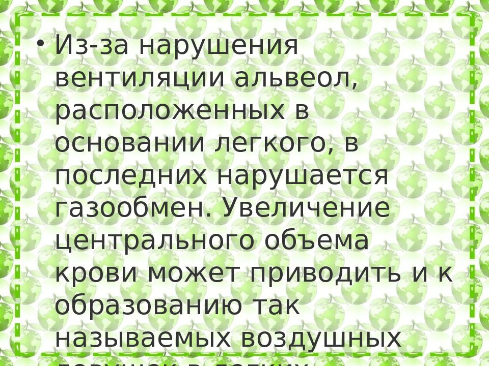Из-за нарушения вентиляции альвеол, расположенных в основании легкого, в последних нарушается газообмен. Увеличение центрального объема крови может приводить и к образованию так называемых воздушных ловушек в легких.