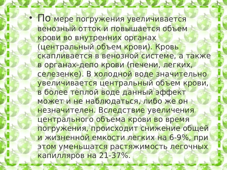 По мере погружения увеличивается венозный отток и повышается объем крови во внутренних органах (центральный объем крови). Кровь скапливается в венозной системе, а также в органах-депо крови (печени, легких, селезенке). В холодной воде значительно увеличивается центральный объем крови, в более теплой воде данный эффект может и не наблюдаться, либо же он незначителен. Вследствие увеличения центрального объема крови во время погружения, происходит снижение общей и жизненной емкости легких на 6-9%, при этом уменьшатся растяжимость легочных капилляров на 21-37%.