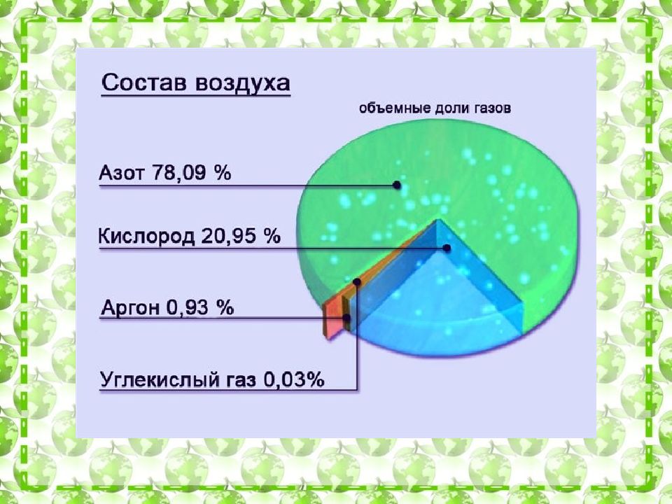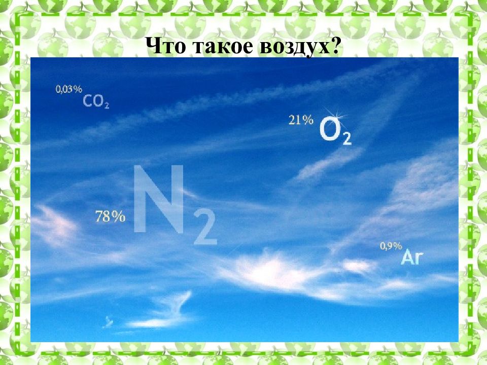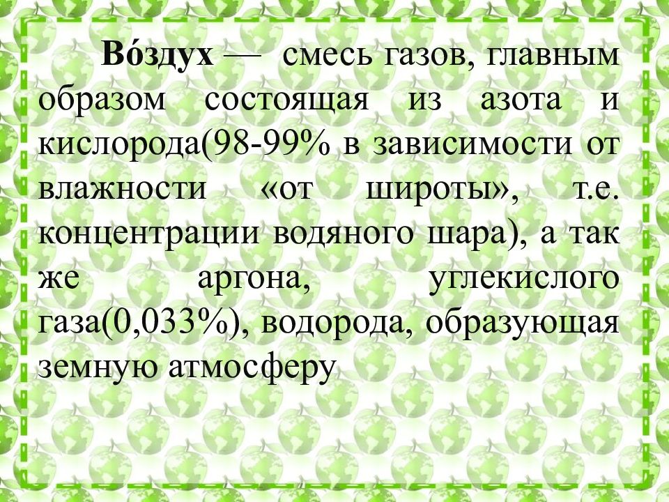 Во́здух — смесь газов, главным образом состоящая из азота и кислорода(98-99% в зависимости от влажности «от широты», т.е. концентрации водяного шара), а так же аргона, углекислого газа(0,033%), водорода, образующая земную атмосферу
