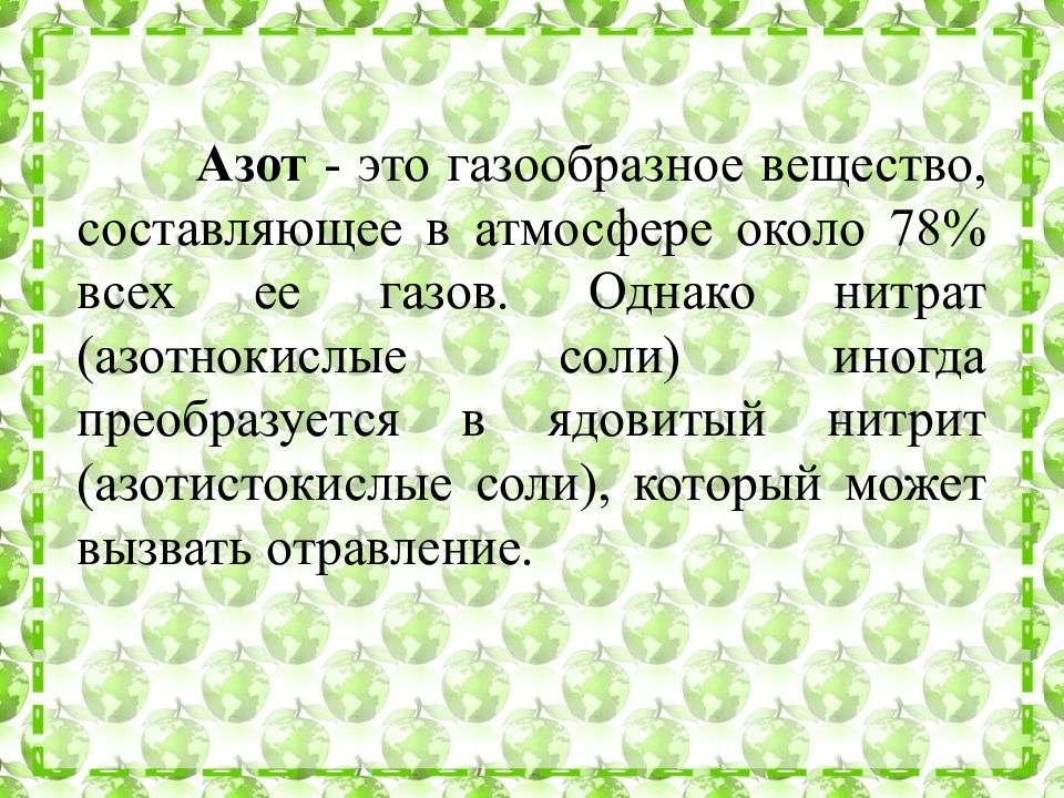 Азот - это газообразное вещество, составляющее в атмосфере около 78% всех ее газов. Однако нитрат (азотнокислые соли) иногда преобразуется в ядовитый нитрит ( азотистокислые соли), который может вызвать отравление.