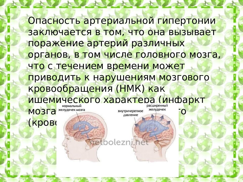 Опасность артериальной гипертонии заключается в том, что она вызывает поражение артерий различных органов, в том числе головного мозга, что с течением времени может приводить к нарушениям мозгового кровообращения (НМК) как ишемического характера (инфаркт мозга), так и геморрагического (кровоизлияние в мозг).