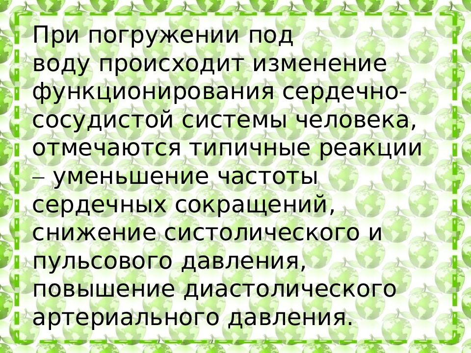 При погружении под воду происходит изменение функционирования сердечно-сосудистой системы человека, отмечаются типичные реакции уменьшение частоты сердечных сокращений, снижение систолического и пульсового давления, повышение диастолического артериального давления.