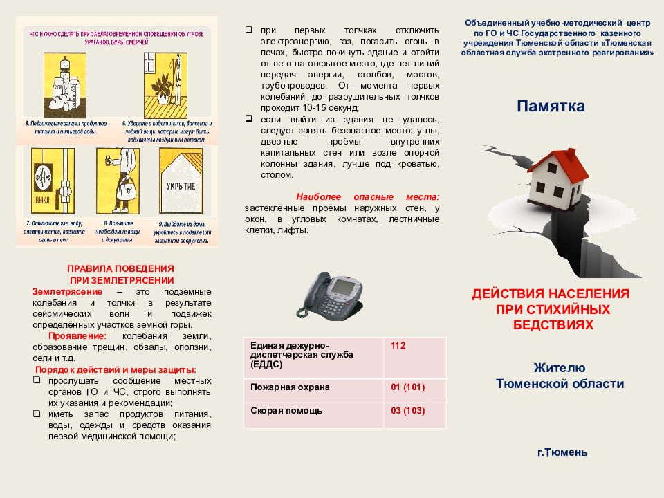 при первых толчках отключить электроэнергию, газ, погасить огонь в печах, быстро покинуть здание и отойти от него на открытое место, где нет линий передач энергии, столбов, мостов, трубопроводов. От момента первых колебаний до разрушительных толчков проходит 10-15 секунд; если выйти из здания не удалось, следует занять безопасное место: углы, дверные проёмы внутренних капитальных стен или возле опорной колонны здания, лучше под кроватью, столом. Наиболее опасные места: застеклённые проёмы наружных стен, у окон, в угловых комнатах, лестничные клетки, лифты. Жителю Тюменской области ДЕЙСТВИЯ НАСЕЛЕНИЯ ПРИ СТИХИЙНЫХ БЕДСТВИЯХ г.Тюмень Единая дежурно-диспетчерская служба (ЕДДС) 112 Пожарная охрана 01 (101) Скорая помощь 03 (103) ПРАВИЛА ПОВЕДЕНИЯ ПРИ ЗЕМЛЕТРЯСЕНИИ Землетрясение – это подземные колебания и толчки в результате сейсмических волн и подвижек определённых участков земной горы. Проявление: колебания земли, образование трещин, обвалы, оползни, сели и т.д. Порядок действий и меры защиты: прослушать сообщение местных органов ГО и ЧС, строго выполнять их указания и рекомендации; иметь запас продуктов питания, воды, одежды и средств оказания первой медицинской помощи; Памятка Объединенный учебно-методический центр по ГО и ЧС Государственного казенного учреждения Тюменской области «Тюменская областная служба экстренного реагирования»