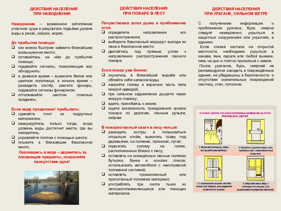 ДЕЙСТВИЯ НАСЕЛЕНИЯ ПРИ НАВОДНЕНИИ Наводнение – временное затопление участков суши в результате подъёма уровня воды в реках, озёрах, морях. До прибытия помощи: как можно быстрее займите ближайшее возвышенное место; оставайтесь на нём до прибытия помощи; подавайте сигналы, позволяющие вас обнаружить: в дневное время – вывесите белое или цветное полотенце, в ночное время – разведите костёр, зажгите фонарь, подавайте сигналы фонариком; отталкивайте шестом опасные предметы. Если вода продолжает прибывать: сделайте плот из подручных материалов; эвакуируйтесь только тогда, когда уровень воды достигнет места, где вы находитесь; управляйте плотом с помощью шеста; плывите в ближайшее безопасное место. Оказавшись в воде – держитесь за плавающие предметы, сохраняйте присутствие духа! ДЕЙСТВИЯ НАСЕЛЕНИЯ ПРИ ПОЖАРЕ В ЛЕСУ Почувствовав запах дыма и приближение огня: определите направление его распространения; выберите безопасный маршрут выхода из леса в безопасное место; двигайтесь под прямым углом к направлению распространения лесного пожара. Если пожар уже близко: окунитесь в ближайший водоём или облейте себя запасом воды; накройте голову и верхнюю часть тела мокрой одеждой; при сильном задымлении дышите через мокрую повязку; идите, пригибаясь к земле; ищите возможность преодоления кромки пожара по дорогам, лесным ручьям, озёрам В пожароопасный сезон в лесу нельзя: разводить костры и пользоваться открытым огнём, выжигать траву под деревьями, на полянах, просеках, лугах; поджигать солому на полях, расположенных близко к лесу; оставлять на освещённых лесных полянах бутылки, банки и осколки стекла; использовать автомобили с неисправной топливной системой; оставлять промасленный или пропитанный топливом материал; употреблять при охоте пыжи из легковоспламеняющихся или тлеющих материалов. ДЕЙСТВИЯ НАСЕЛЕНИЯ ПРИ УРАГАНЕ, СИЛЬНОМ ВЕТРЕ С получением информации о приближении урагана, бури, смерча следует немедленно укрыться в защитных сооружениях или укрытиях, в зданиях. Если стихия застала на открытой местности, необходимо укрыться в канаве, яме, овраге или любой выемке, лечь на дно и плотно прижаться к земле. После ураганов, бурь, смерчей не рекомендуется заходить в повреждённые здания, не убедившись в безопасности и отсутствии значительных повреждений лестниц, стен, потолков.