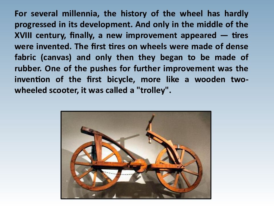 For several millennia, the history of the wheel has hardly progressed in its development. And only in the middle of the XVIII century, finally, a new improvement appeared — tires were invented. The first tires on wheels were made of dense fabric (canvas) and only then they began to be made of rubber. One of the pushes for further improvement was the invention of the first bicycle, more like a wooden two-wheeled scooter, it was called a "trolley".
