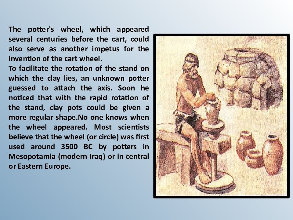 The potter's wheel, which appeared several centuries before the cart, could also serve as another impetus for the invention of the cart wheel. To facilitate the rotation of the stand on which the clay lies, an unknown potter guessed to attach the axis. Soon he noticed that with the rapid rotation of the stand, clay pots could be given a more regular shape.No one knows when the wheel appeared. Most scientists believe that the wheel (or circle) was first used around 3500 BC by potters in Mesopotamia (modern Iraq) or in central or Eastern Europe.