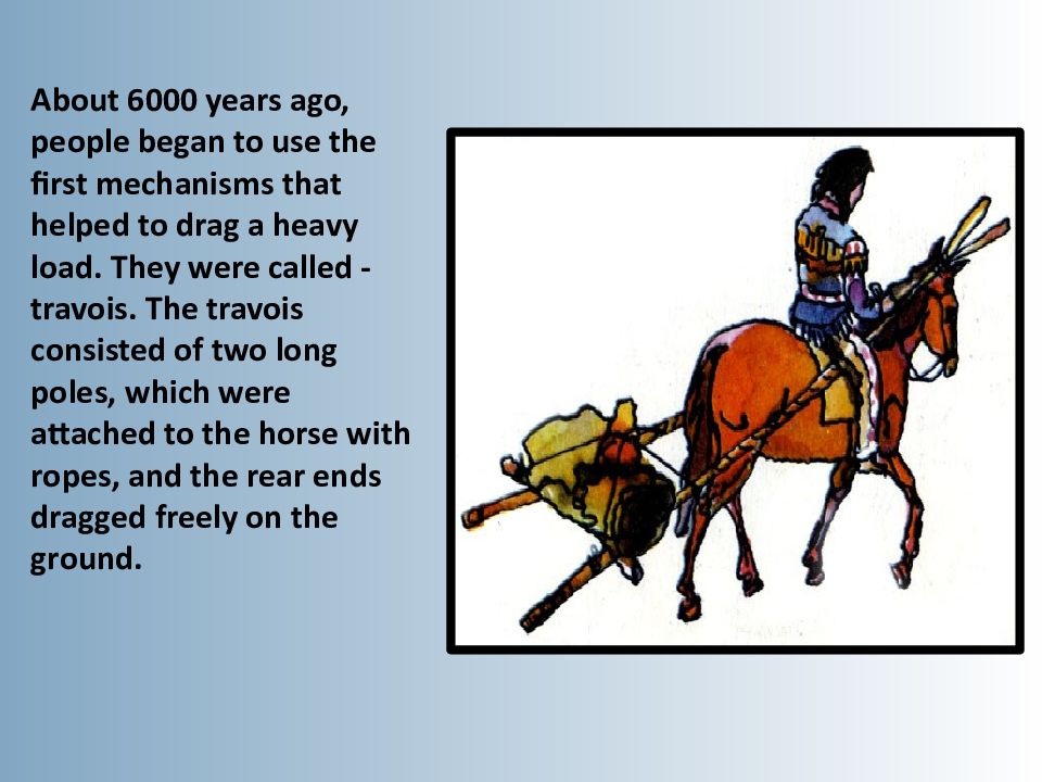 About 6000 years ago, people began to use the first mechanisms that helped to drag a heavy load. They were called - travois. The travois consisted of two long poles, which were attached to the horse with ropes, and the rear ends dragged freely on the ground.
