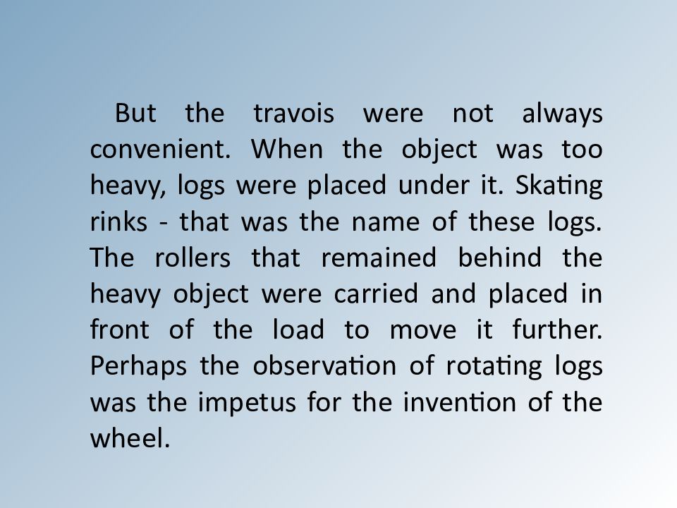 But the travois were not always convenient. When the object was too heavy, logs were placed under it. Skating rinks - that was the name of these logs. The rollers that remained behind the heavy object were carried and placed in front of the load to move it further. Perhaps the observation of rotating logs was the impetus for the invention of the wheel.
