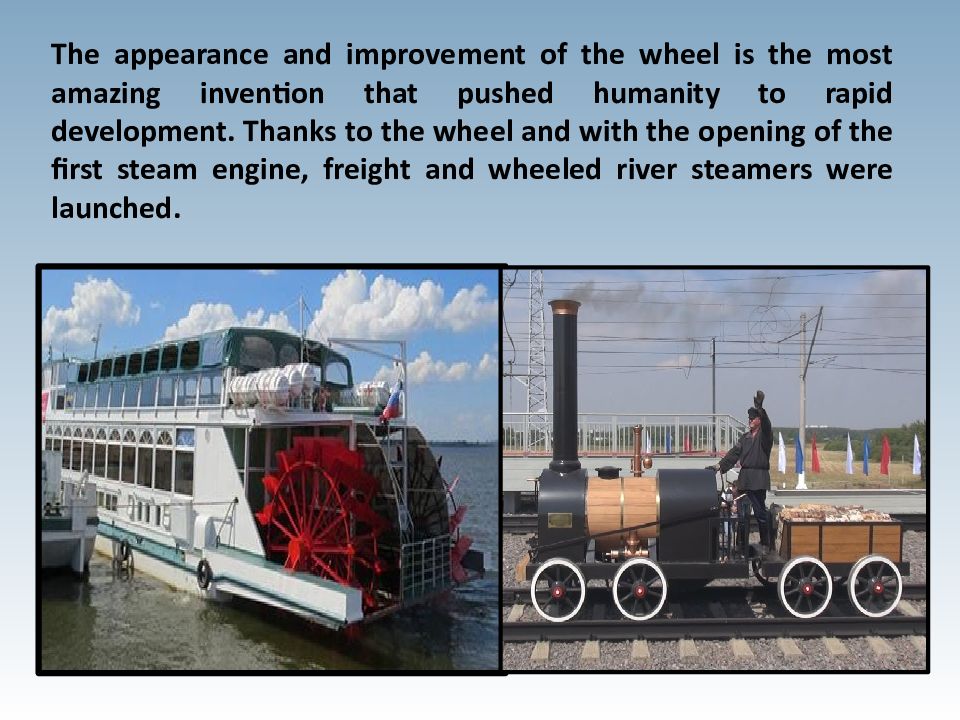 The appearance and improvement of the wheel is the most amazing invention that pushed humanity to rapid development. Thanks to the wheel and with the opening of the first steam engine, freight and wheeled river steamers were launched.