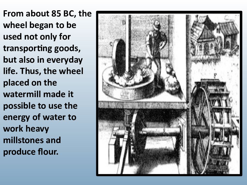 From about 85 BC, the wheel began to be used not only for transporting goods, but also in everyday life. Thus, the wheel placed on the watermill made it possible to use the energy of water to work heavy millstones and produce flour.