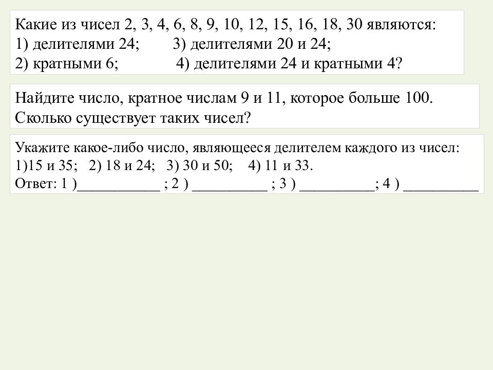 Найдите число, кратное числам 9 и 11, которое больше 100. Сколько существует таких чисел? Какие из чисел 2, 3, 4, 6, 8, 9, 10, 12, 15, 16, 18, 30 являются: 1) делителями 24; 3 ) делителями 20 и 24; 2) кратными 6; 4 ) делителями 24 и кратными 4? Укажите какое-либо число, являющееся делителем каждого из чисел: 1)15 и 35; 2 ) 18 и 24; 3 ) 30 и 50; 4 ) 11 и 33. Ответ: 1 )___________ ; 2 ) __________ ; 3 ) __________; 4 ) __________