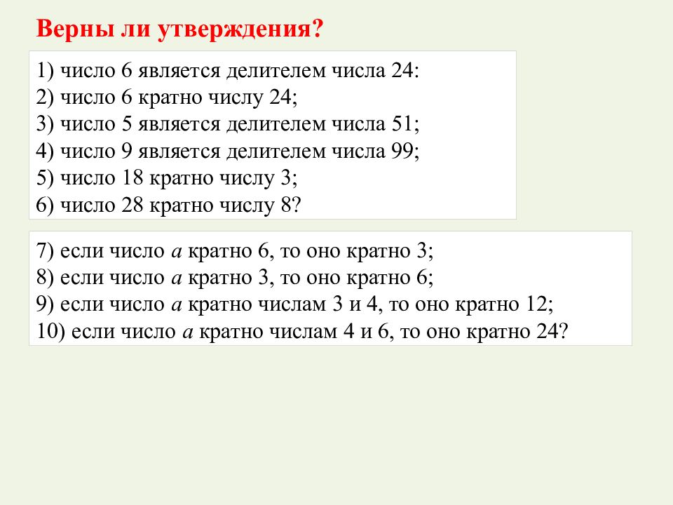 1 ) число 6 является делителем числа 24: 2 ) число 6 кратно числу 24; 3) число 5 является делителем числа 51; 4) число 9 является делителем числа 99; 5) число 18 кратно числу 3; 6) число 28 кратно числу 8? 7) если число а кратно 6, то оно кратно 3; 8) если число а кратно 3, то оно кратно 6; 9) если число а кратно числам 3 и 4, то оно кратно 12; 10) если число а кратно числам 4 и 6, то оно кратно 24 ?