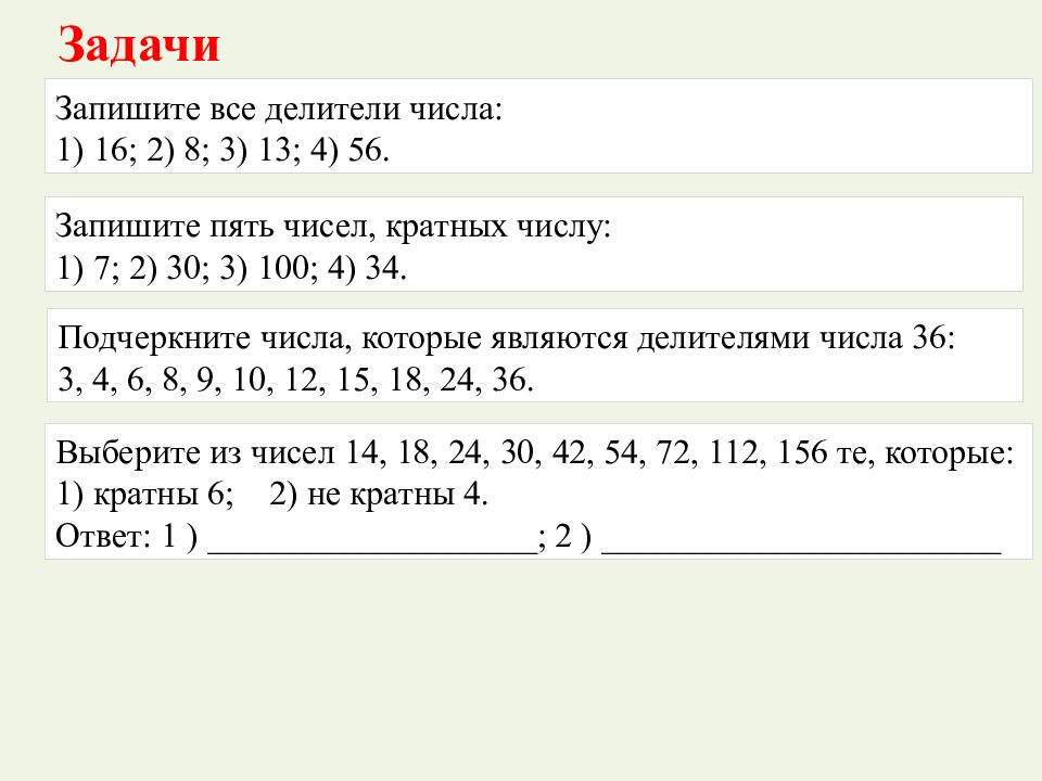 Запишите все делители числа: 1) 16; 2) 8; 3) 13; 4) 56. Запишите пять чисел, кратных числу: 1) 7; 2) 30; 3) 100; 4) 34. Подчеркните числа, которые являются делителями числа 36: 3, 4, 6, 8, 9, 10, 12, 15, 18, 24, 36. Выберите из чисел 14, 18, 24, 30, 42, 54, 72, 112, 156 те, которые: 1) кратны 6; 2 ) не кратны 4. Ответ: 1 ) ___________________; 2 ) _______________________