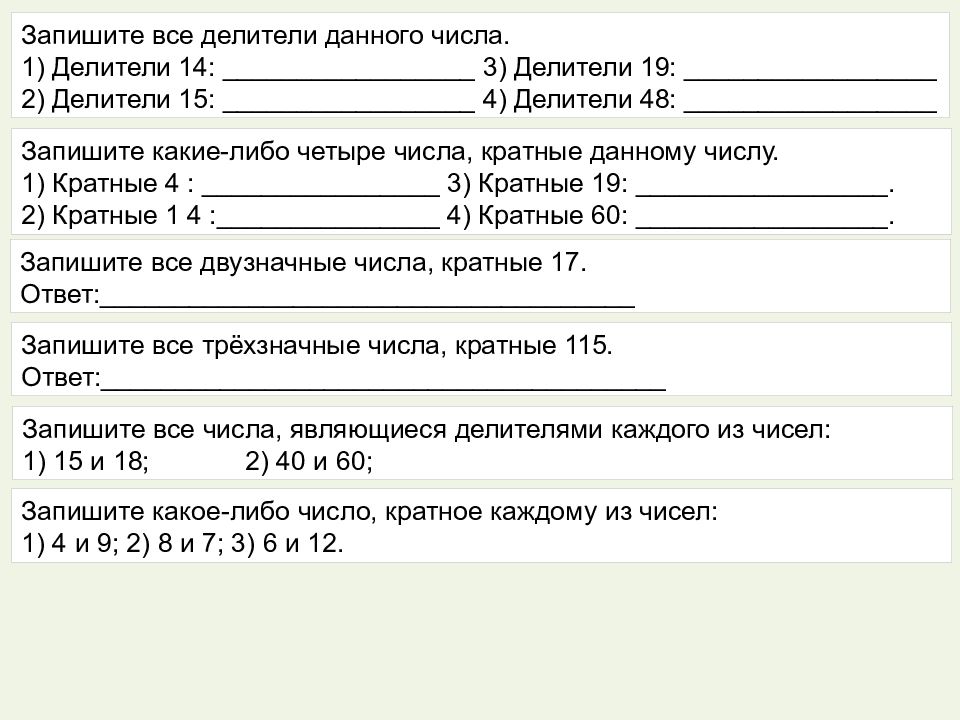 Запишите все делители данного числа. 1) Делители 14: _________________ 3) Делители 19 : _________________ 2) Делители 15: _________________ 4) Делители 48 : _________________ Запишите какие-либо четыре числа, кратные данному числу. 1) Кратные 4 : ________________ 3) Кратные 19 : _________________. 2) Кратные 1 4 :_______________ 4) Кратные 60 : _________________. Запишите все двузначные числа, кратные 17. Ответ:____________________________________ Запишите все трёхзначные числа, кратные 115. Ответ:______________________________________ Запишите все числа, являющиеся делителями каждого из чисел : 1) 15 и 18 ; 2 ) 40 и 60; Запишите какое-либо число, кратное каждому из чисел: 1) 4 и 9; 2) 8 и 7 ; 3) 6 и 12.