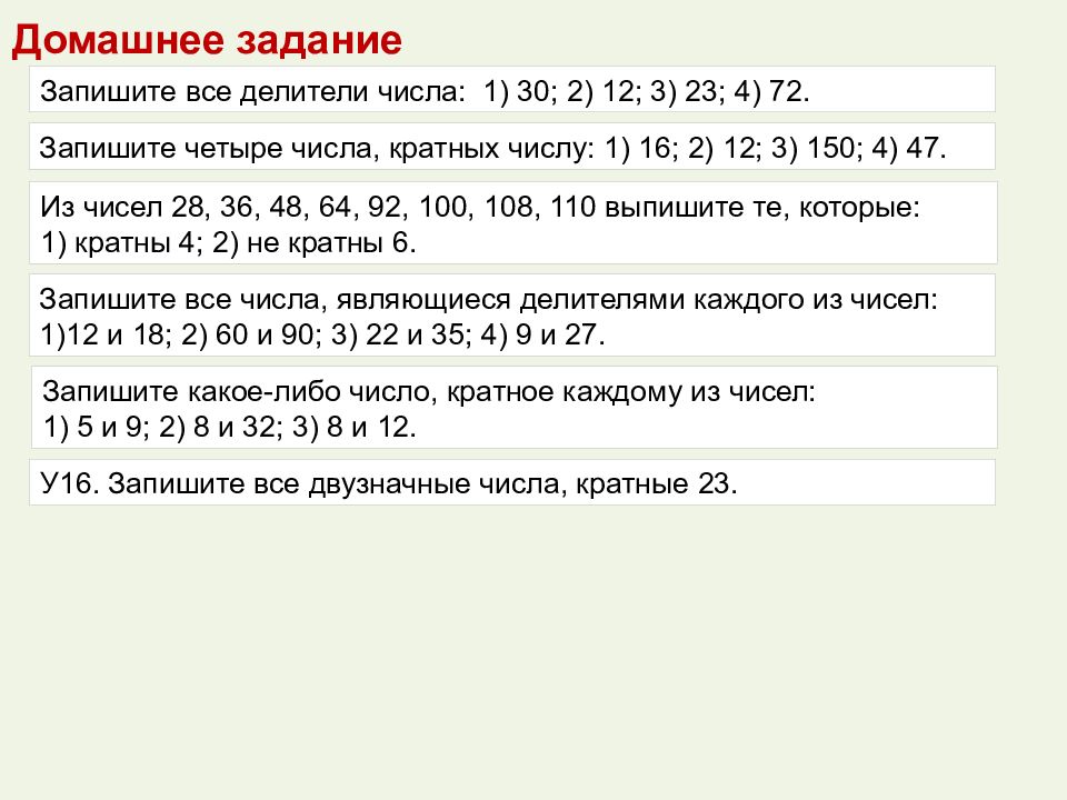 Запишите все делители числа: 1 ) 30; 2) 12; 3) 23; 4) 72. Запишите четыре числа, кратных числу: 1 ) 16; 2) 12; 3) 150; 4) 47. Запишите все числа, являющиеся делителями каждого из чисел: 1)12 и 18; 2) 60 и 90; 3) 22 и 35; 4) 9 и 27. Запишите какое-либо число, кратное каждому из чисел: 1) 5 и 9; 2) 8 и 32; 3) 8 и 12. Из чисел 28, 36, 48, 64, 92, 100, 108, 110 выпишите те, которые: 1) кратны 4; 2) не кратны 6. У16. Запишите все двузначные числа, кратные 23.