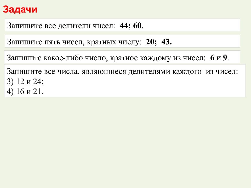 Запишите все делители чисел: 44; 60. Запишите пять чисел, кратных числу: 20 ; 43. Запишите все числа, являющиеся делителями каждого из чисел : 3 ) 12 и 24; 4 ) 16 и 21. Запишите какое-либо число, кратное каждому из чисел: 6 и 9.