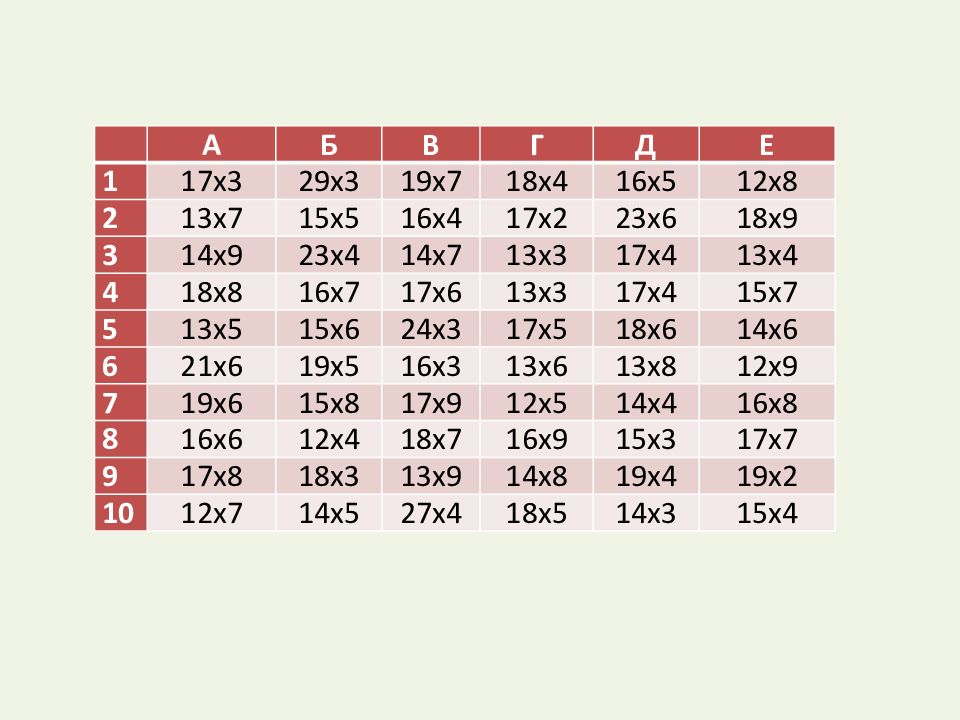 А Б В Г Д Е 1 17х3 29х3 19х7 18х4 16х5 12х8 2 13х7 15х5 16х4 17х2 23х6 18х9 3 14х9 23х4 14х7 13х3 17х4 13х4 4 18х8 16х7 17х6 13х3 17х4 15х7 5 13х5 15х6 24х3 17х5 18х6 14х6 6 21х6 19х5 16х3 13х6 13х8 12х9 7 19х6 15х8 17х9 12х5 14х4 16х8 8 16х6 12х4 18х7 16х9 15х3 17х7 9 17х8 18х3 13х9 14х8 19х4 19х2 10 12х7 14х5 27х4 18х5 14х3 15х4