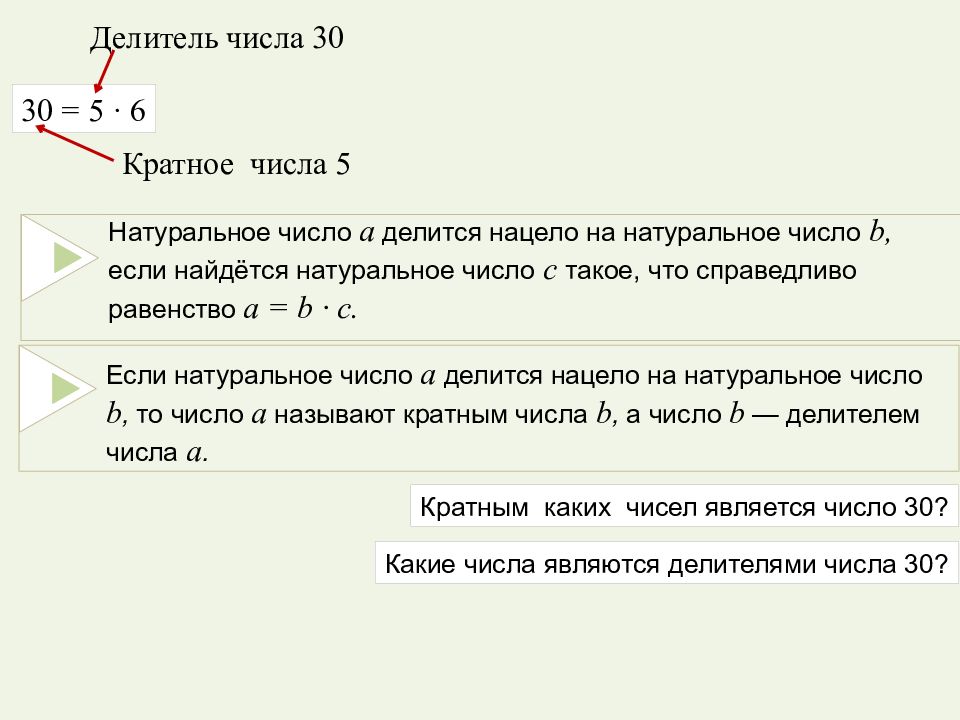 3 0 = 5 · 6 Делител ь числа 30 Кратное числа 5 Натуральное число а делится нацело на натуральное число b, если найдётся натуральное число с такое, что справедливо равенство а = b · с. Если натуральное число а делится нацело на натуральное число b, то число а называют кратным числа b, а число b — делителем числа а. Какие числа являются делителями числа 30? Кратным каких чисел является число 30?