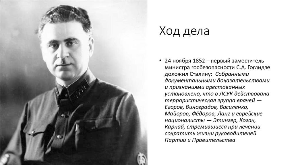 24 ноября 1852—первый заместитель министра госбезопасности С.А. Гоглидзе доложил Сталину: Собранными документальными доказательствами и признаниями арестованных установлено, что в ЛСУК действовала террористическая группа врачей — Егоров, Виноградов, Василенко, Майоров, Фёдоров, Ланг и еврейские националисты — Этингер, Коган, Карпай, стремившиеся при лечении сократить жизни руководителей Партии и Правительства