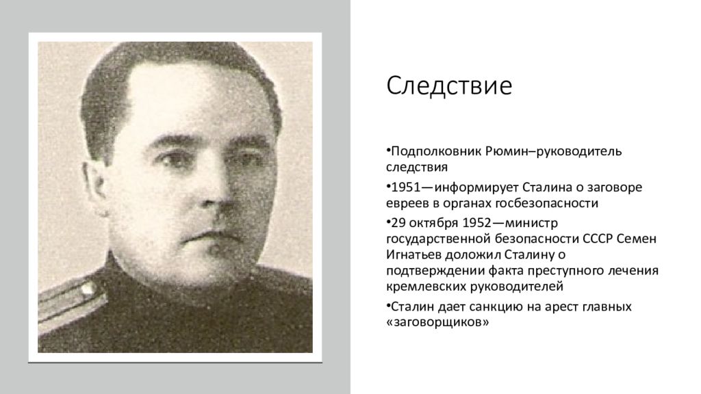 Подполковник Рюмин – руководитель следствия 1 9 51— информирует Сталина о заговоре евреев в органах госбезопасности 29 октября 1 9 52— министр государственной безопасности СССР Семен Игнатьев доложил Сталину о подтверждении факта преступного лечения кремлевских руководителей Сталин дает санкцию на арест главных « заговорщиков »