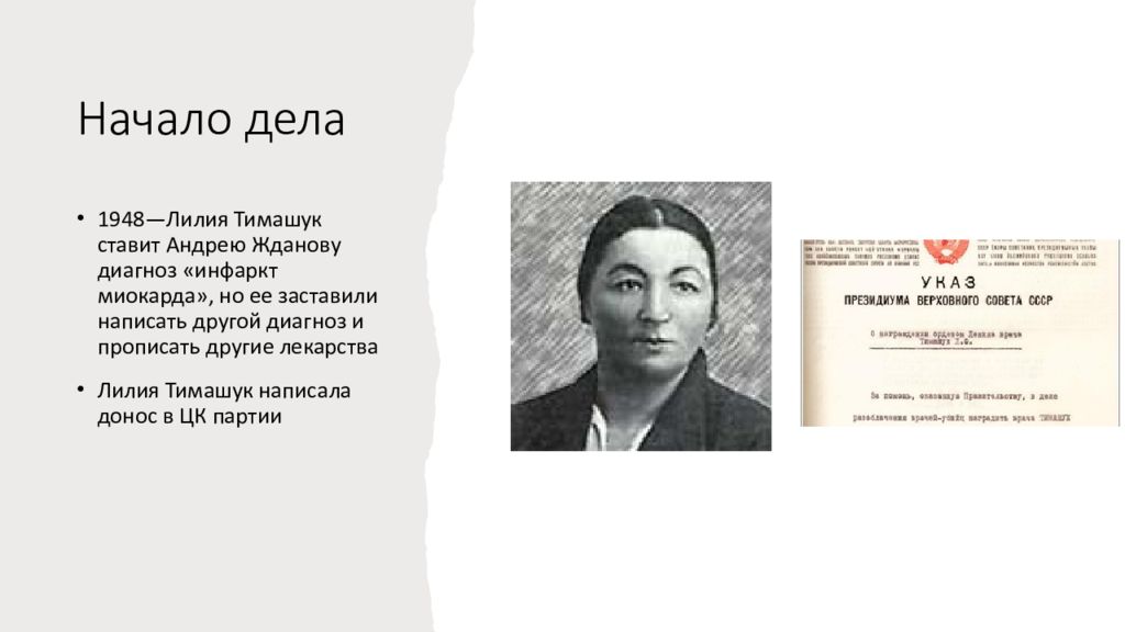 1948— Лилия Тимашук ставит Андрею Жданову диагноз « инфаркт миокарда », но ее заставили написать другой диагно з и прописать другие лекарства Лилия Тимашук написала донос в ЦК партии