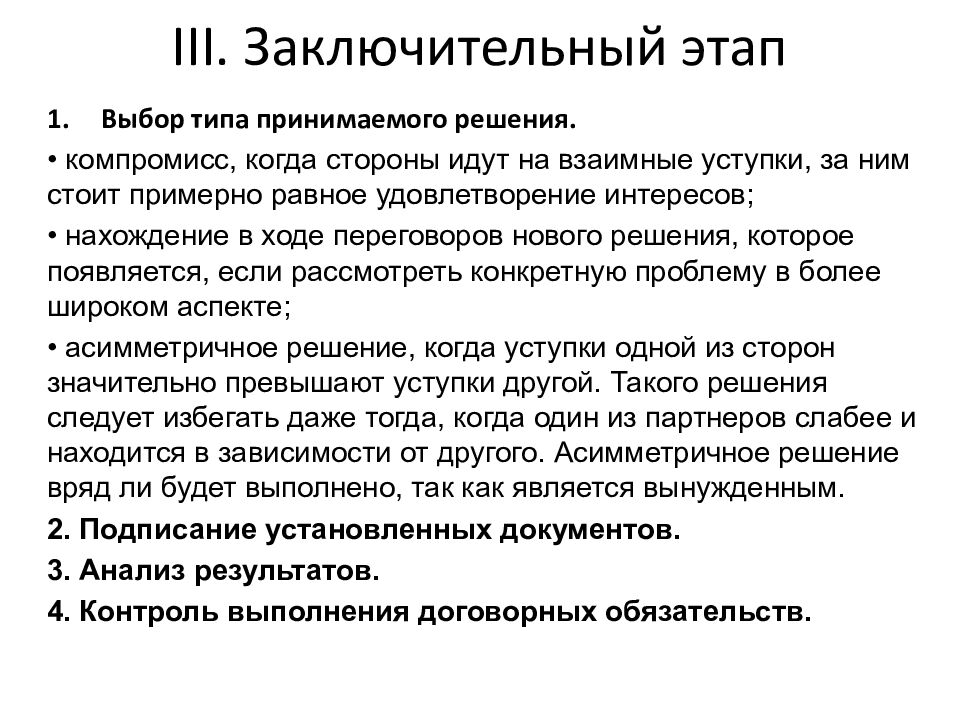 Выбор типа принимаемого решения. • компромисс, когда стороны идут на взаимные уступки, за ним стоит примерно равное удовлетворение интересов; • нахождение в ходе переговоров нового решения, которое появляется, если рассмотреть конкретную проблему в более широком аспекте; • асимметричное решение, когда уступки одной из сторон значительно превышают уступки другой. Такого решения следует избегать даже тогда, когда один из партнеров слабее и находится в зависимости от другого. Асимметричное решение вряд ли будет выполнено, так как является вынужденным. 2. Подписание установленных документов. 3. Анализ результатов. 4. Контроль выполнения договорных обязательств.