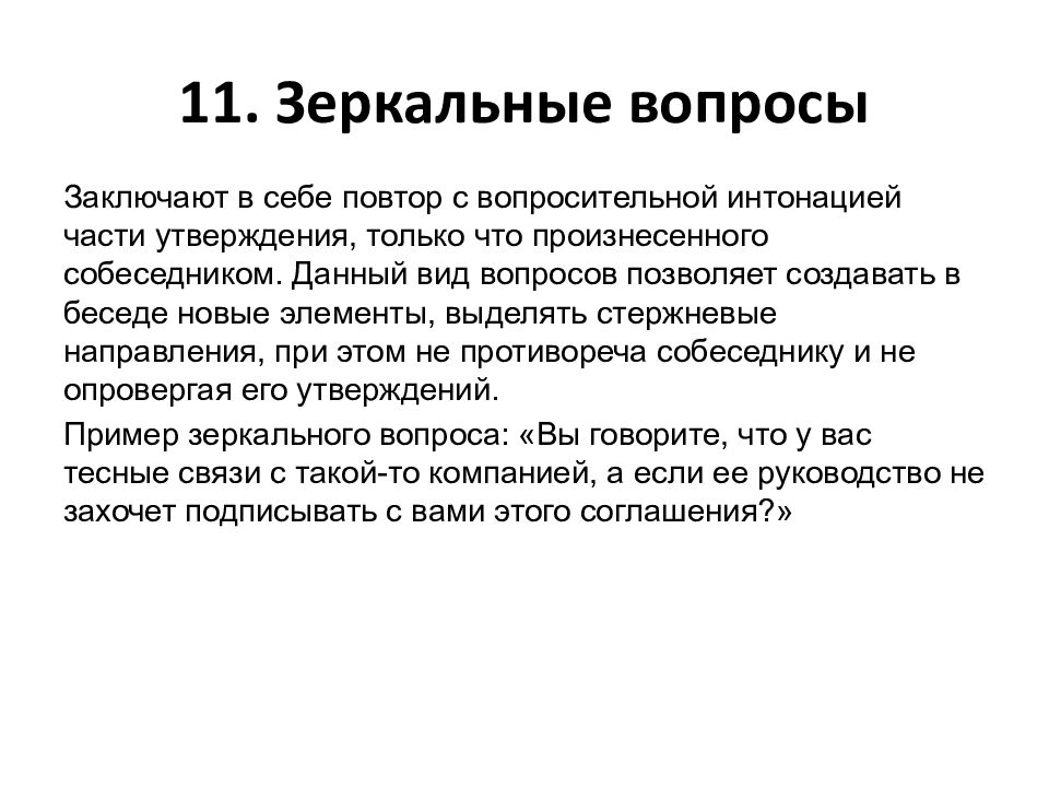 Заключают в себе повтор с вопросительной интонацией части утверждения, только что произнесенного собеседником. Данный вид вопросов позволяет создавать в беседе новые элементы, выделять стержневые направления, при этом не противореча собеседнику и не опровергая его утверждений. Пример зеркального вопроса: «Вы говорите, что у вас тесные связи с такой-то компанией, а если ее руководство не захочет подписывать с вами этого соглашения?»