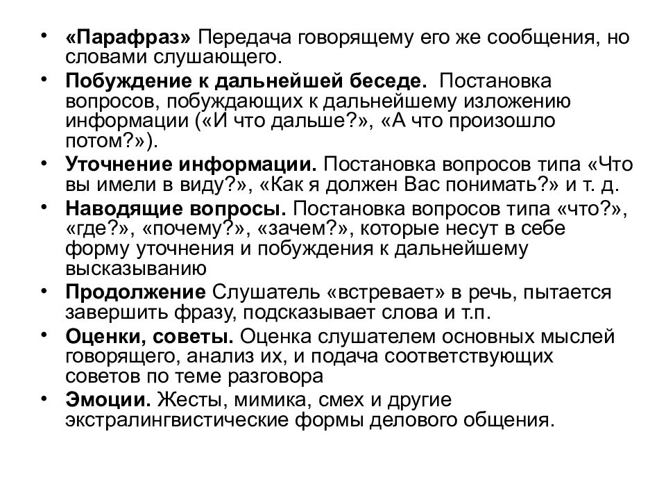 «Парафраз» Передача говорящему его же сообщения, но словами слушающего. Побуждение к дальнейшей беседе. Постановка вопросов, побуждающих к дальнейшему изложению информации («И что дальше?», «А что произошло потом?»). Уточнение информации. Постановка вопросов типа «Что вы имели в виду?», «Как я должен Вас понимать?» и т. д. Наводящие вопросы. Постановка вопросов типа «что?», «где?», «почему?», «зачем?», которые несут в себе форму уточнения и побуждения к дальнейшему высказыванию Продолжение Слушатель «встревает» в речь, пытается завершить фразу, подсказывает слова и т.п. Оценки, советы. Оценка слушателем основных мыслей говорящего, анализ их, и подача соответствующих советов по теме разговора Эмоции. Жесты, мимика, смех и другие экстралингвистические формы делового общения.