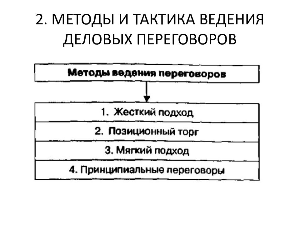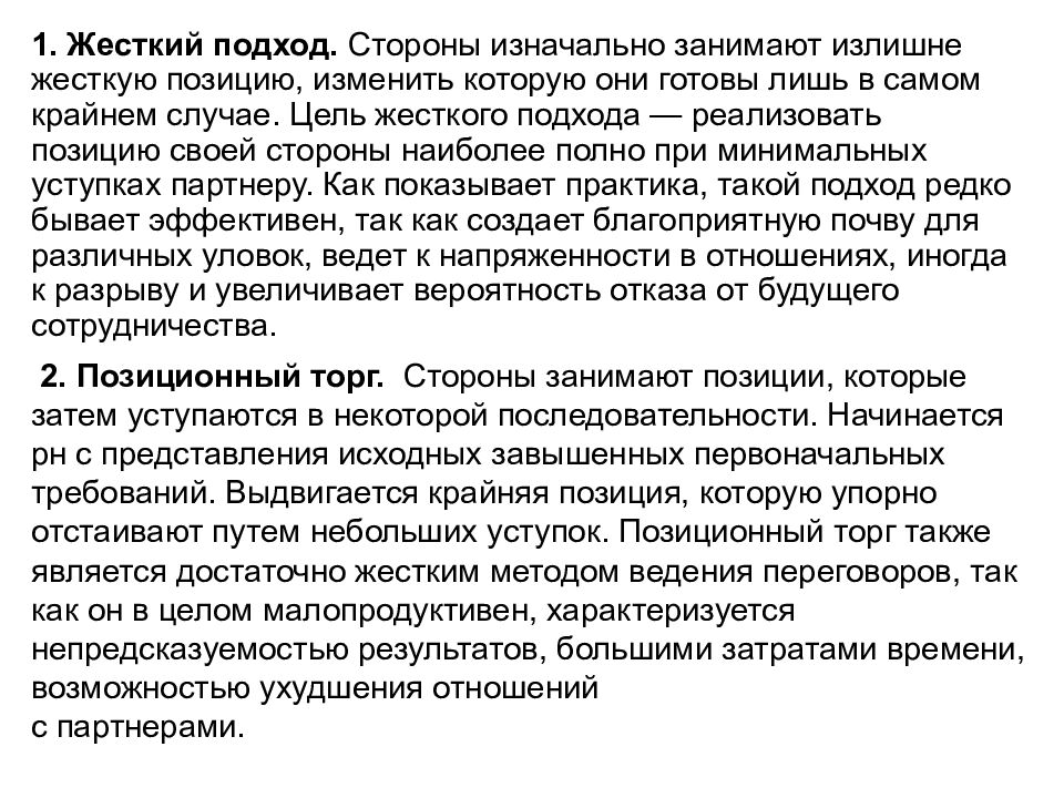 1. Жесткий подход. Стороны изначально занимают излишне жесткую позицию, изменить которую они готовы лишь в самом крайнем случае. Цель жесткого подхода — реализовать позицию своей стороны наиболее полно при минимальных уступках партнеру. Как показывает практика, такой подход редко бывает эффективен, так как создает благоприятную почву для различных уловок, ведет к напряженности в отношениях, иногда к разрыву и увеличивает вероятность отказа от будущего сотрудничества. 2. Позиционный торг. Стороны занимают позиции, которые затем уступаются в некоторой последовательности. Начинается рн с представления исходных завышенных первоначальных требований. Выдвигается крайняя позиция, которую упорно отстаивают путем небольших уступок. Позиционный торг также является достаточно жестким методом ведения переговоров, так как он в целом малопродуктивен, характеризуется непредсказуемостью результатов, большими затратами времени, возможностью ухудшения отношений с партнерами.