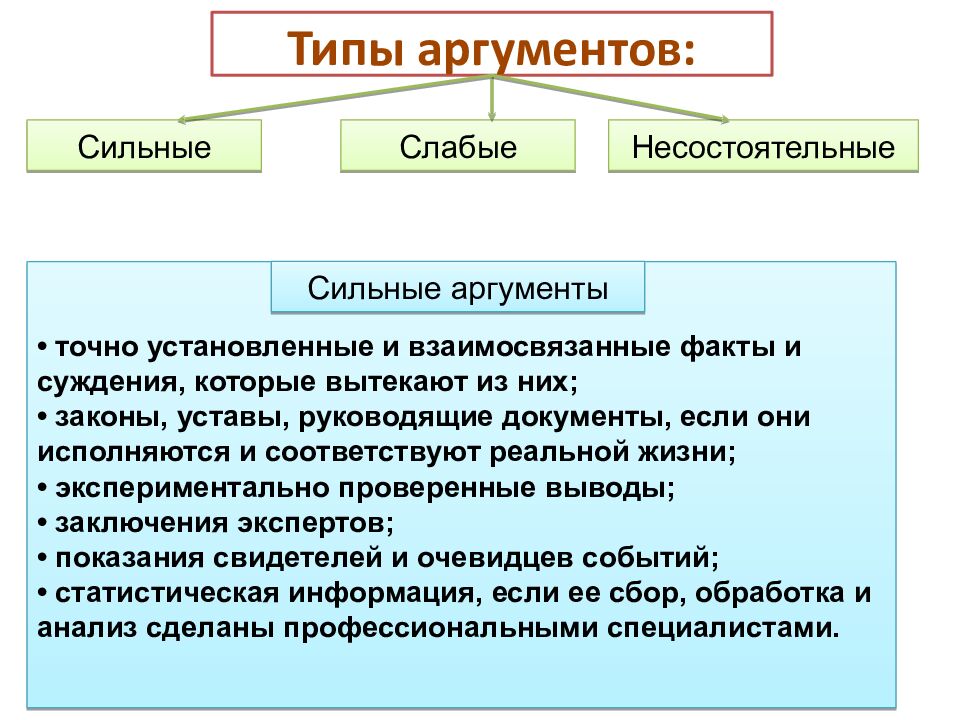 Сильные Слабые • точно установленные и взаимосвязанные факты и суждения, которые вытекают из них; • законы, уставы, руководящие документы, если они исполняются и соответствуют реальной жизни; • экспериментально проверенные выводы; • заключения экспертов; • показания свидетелей и очевидцев событий; • статистическая информация, если ее сбор, обработка и анализ сделаны профессиональными специалистами. Несостоятельные Сильные аргументы