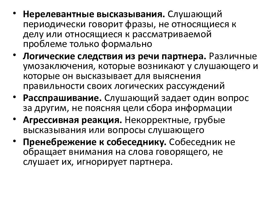 Нерелевантные высказывания. Слушающий периодически говорит фразы, не относящиеся к делу или относящиеся к рассматриваемой проблеме только формально Логические следствия из речи партнера. Различные умозаключения, которые возникают у слушающего и которые он высказывает для выяснения правильности своих логических рассуждений Расспрашивание. Слушающий задает один вопрос за другим, не поясняя цели сбора информации Агрессивная реакция. Некорректные, грубые высказывания или вопросы слушающего Пренебрежение к собеседнику. Собеседник не обращает внимания на слова говорящего, не слушает их, игнорирует партнера.