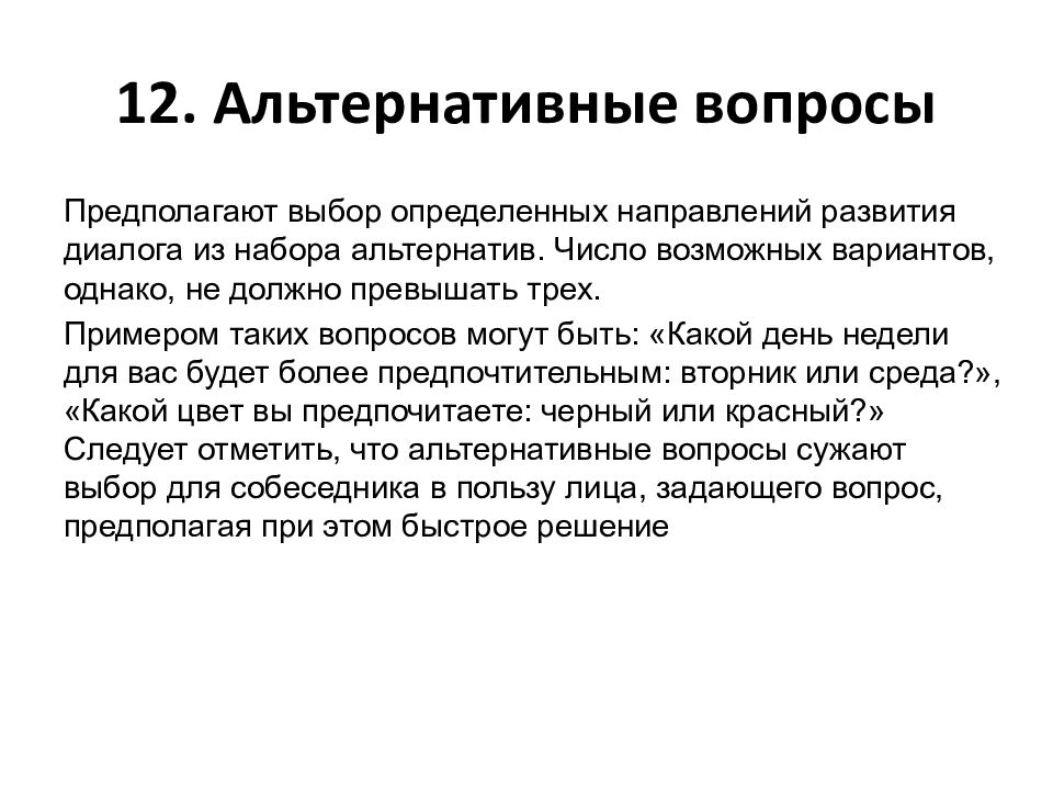 Предполагают выбор определенных направлений развития диалога из набора альтернатив. Число возможных вариантов, однако, не должно превышать трех. Примером таких вопросов могут быть: «Какой день недели для вас будет более предпочтительным: вторник или среда?», «Какой цвет вы предпочитаете: черный или красный?» Следует отметить, что альтернативные вопросы сужают выбор для собеседника в пользу лица, задающего вопрос, предполагая при этом быстрое решение