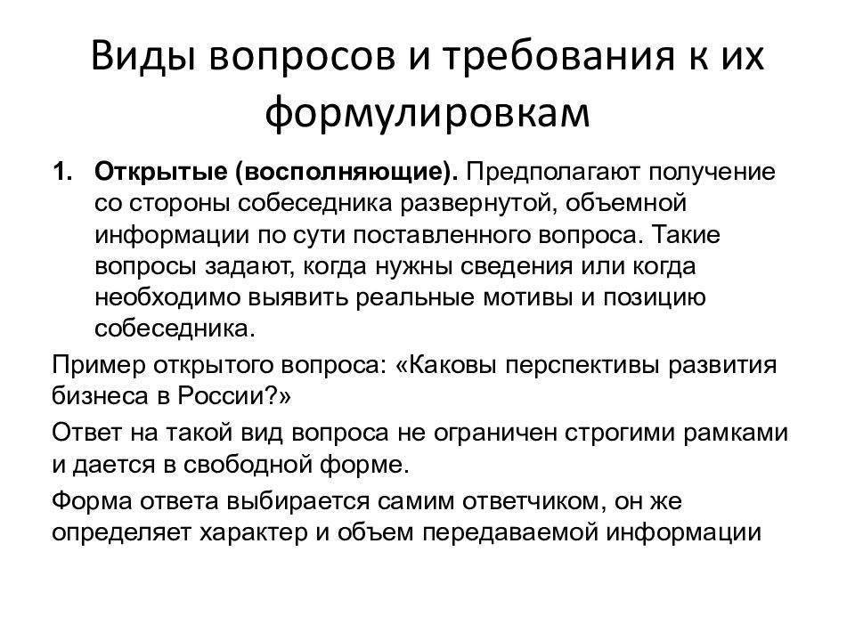 Открытые (восполняющие). Предполагают получение со стороны собеседника развернутой, объемной информации по сути поставленного вопроса. Такие вопросы задают, когда нужны сведения или когда необходимо выявить реальные мотивы и позицию собеседника. Пример открытого вопроса: «Каковы перспективы развития бизнеса в России?» Ответ на такой вид вопроса не ограничен строгими рамками и дается в свободной форме. Форма ответа выбирается самим ответчиком, он же определяет характер и объем передаваемой информации