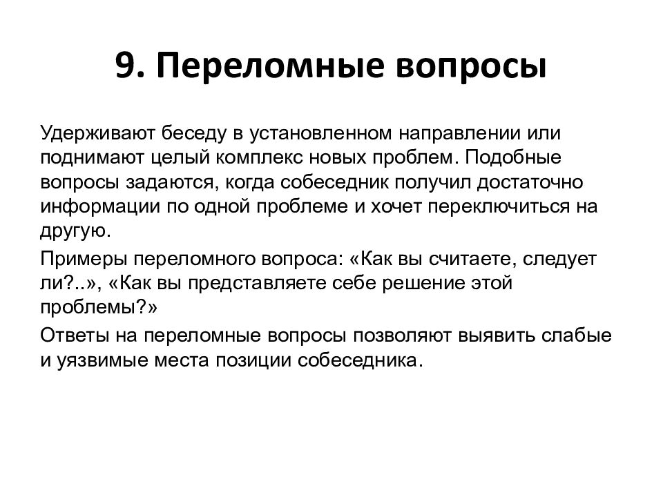 Удерживают беседу в установленном направлении или поднимают целый комплекс новых проблем. Подобные вопросы задаются, когда собеседник получил достаточно информации по одной проблеме и хочет переключиться на другую. Примеры переломного вопроса: «Как вы считаете, следует ли?..», «Как вы представляете себе решение этой проблемы?» Ответы на переломные вопросы позволяют выявить слабые и уязвимые места позиции собеседника.