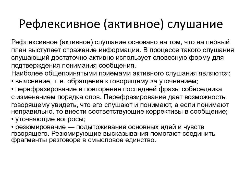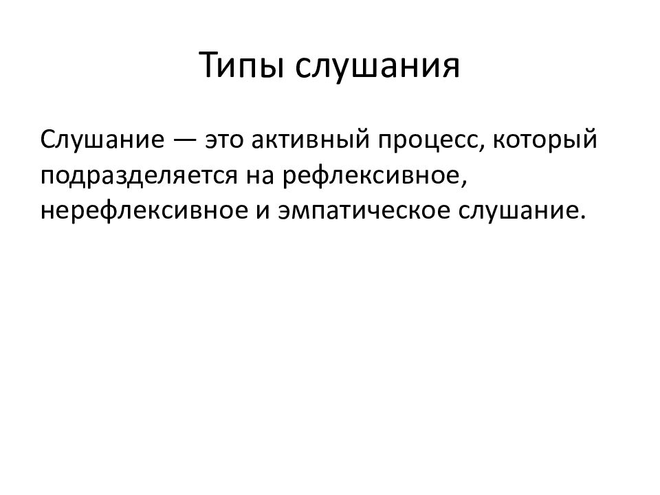 Слушание — это активный процесс, который подразделяется на рефлексивное, нерефлексивное и эмпатическое слушание.