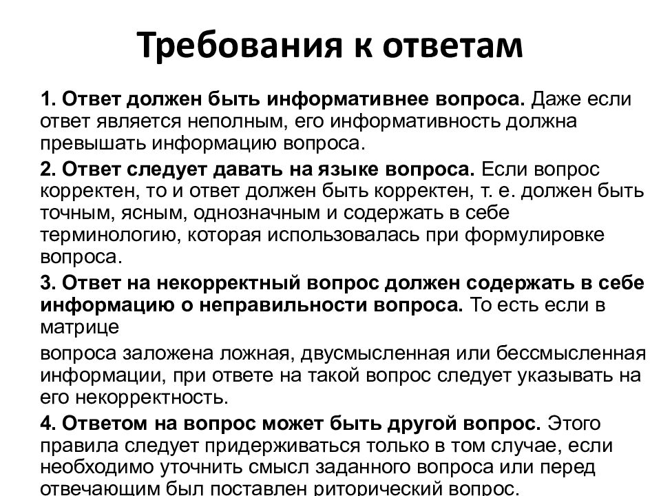 1. Ответ должен быть информативнее вопроса. Даже если ответ является неполным, его информативность должна превышать информацию вопроса. 2. Ответ следует давать на языке вопроса. Если вопрос корректен, то и ответ должен быть корректен, т. е. должен быть точным, ясным, однозначным и содержать в себе терминологию, которая использовалась при формулировке вопроса. 3. Ответ на некорректный вопрос должен содержать в себе информацию о неправильности вопроса. То есть если в матрице вопроса заложена ложная, двусмысленная или бессмысленная информации, при ответе на такой вопрос следует указывать на его некорректность. 4. Ответом на вопрос может быть другой вопрос. Этого правила следует придерживаться только в том случае, если необходимо уточнить смысл заданного вопроса или перед отвечающим был поставлен риторический вопрос.