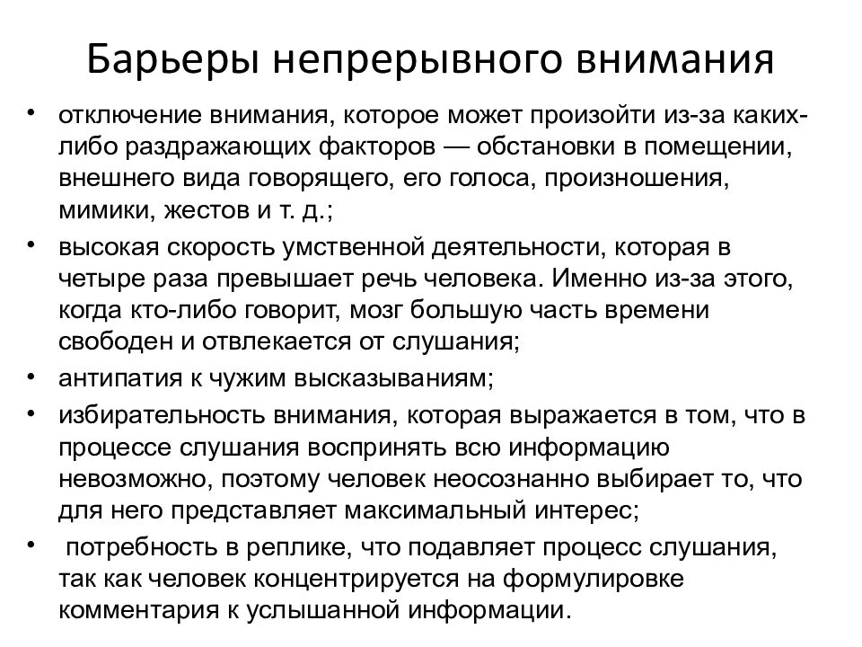 отключение внимания, которое может произойти из-за каких-либо раздражающих факторов — обстановки в помещении, внешнего вида говорящего, его голоса, произношения, мимики, жестов и т. д.; высокая скорость умственной деятельности, которая в четыре раза превышает речь человека. Именно из-за этого, когда кто-либо говорит, мозг большую часть времени свободен и отвлекается от слушания; антипатия к чужим высказываниям; избирательность внимания, которая выражается в том, что в процессе слушания воспринять всю информацию невозможно, поэтому человек неосознанно выбирает то, что для него представляет максимальный интерес; потребность в реплике, что подавляет процесс слушания, так как человек концентрируется на формулировке комментария к услышанной информации.
