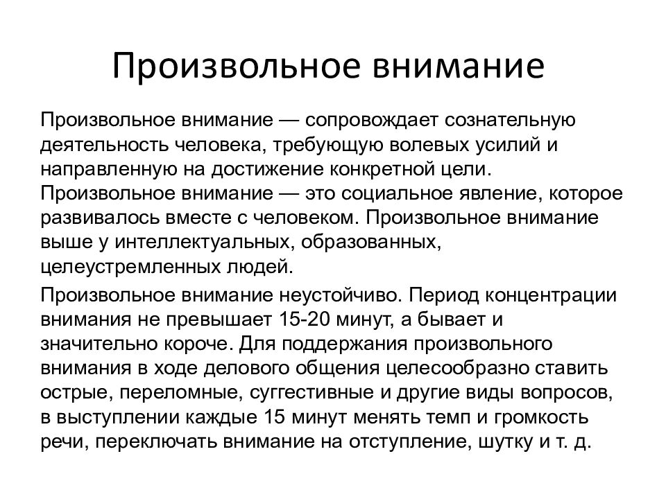 Произвольное внимание — сопровождает сознательную деятельность человека, требующую волевых усилий и направленную на достижение конкретной цели. Произвольное внимание — это социальное явление, которое развивалось вместе с человеком. Произвольное внимание выше у интеллектуальных, образованных, целеустремленных людей. Произвольное внимание неустойчиво. Период концентрации внимания не превышает 15-20 минут, а бывает и значительно короче. Для поддержания произвольного внимания в ходе делового общения целесообразно ставить острые, переломные, суггестивные и другие виды вопросов, в выступлении каждые 15 минут менять темп и громкость речи, переключать внимание на отступление, шутку и т. д.