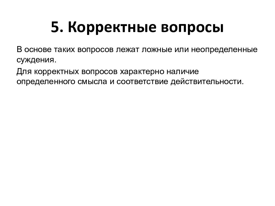 В основе таких вопросов лежат ложные или неопределенные суждения. Для корректных вопросов характерно наличие определенного смысла и соответствие действительности.